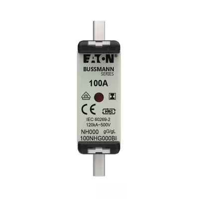 zekering, zekeringelement, Lage spanning, 100 A, AC 500 V, NH000, gL/gG, IEC, dubbel (combinatie-) meldersysteem, vierkant huis met mescontacten, geïsoleerde grepen, IEC 60269-2 zekeringsysteem A, DIN 43620, VDE 0636-2, uitschakelvermogen 120 kA