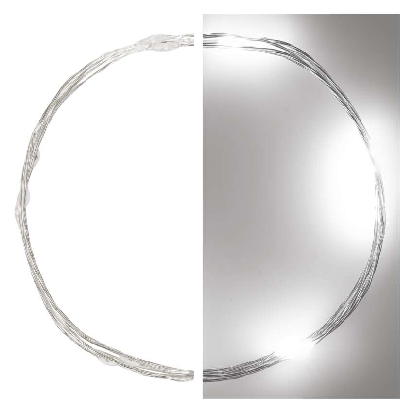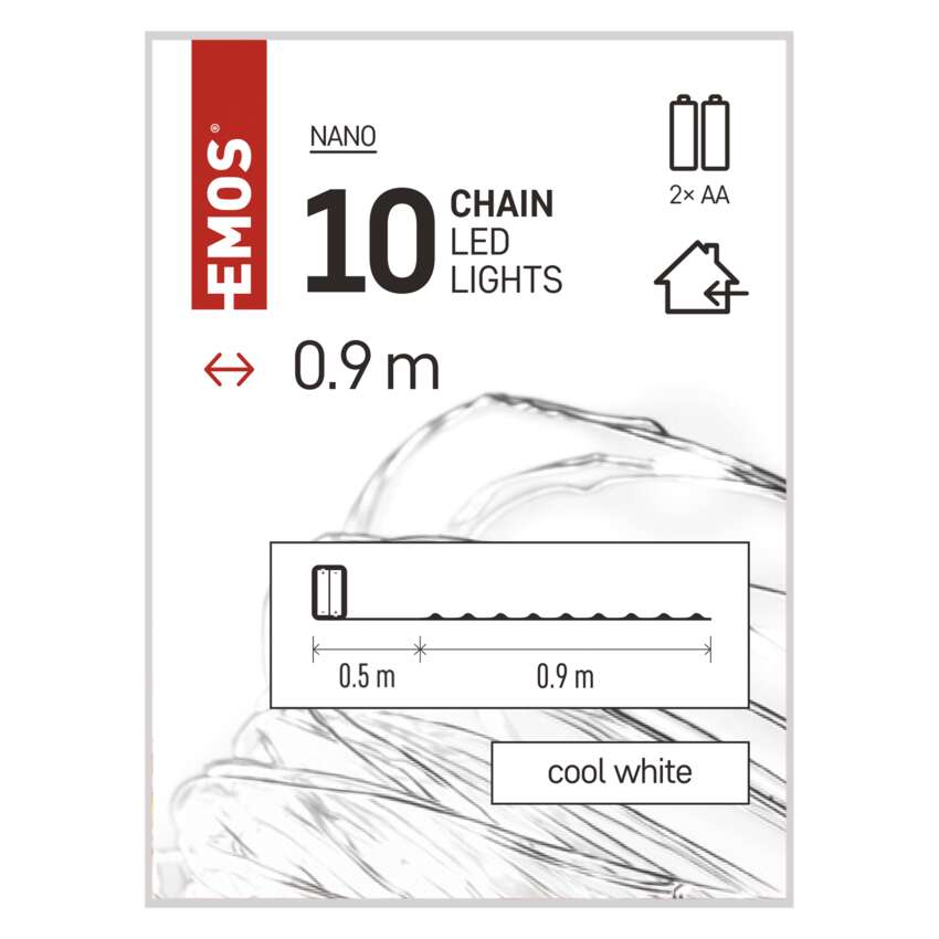 typ zasilania: baterie 2× AA (brak w zestawie), kształt: nano, ilość LED: 10, odstęp między diodami LED: 10 cm, wielkość diod LED: micro LED, długość przewodu: 0,5 m, do wysokości choinki: nie dotyczy, kolor przewodów: srebrna, moc: 0,6 W, napięcie wyjściowe: 3 V DC, możliwość podłączenia: nie, stopień ochrony: IP20, żywotność: 10 000 godzin, materiał: metalowy, okres gwarancyjny: 2 lata, opakowanie: 1 szt., pudełko