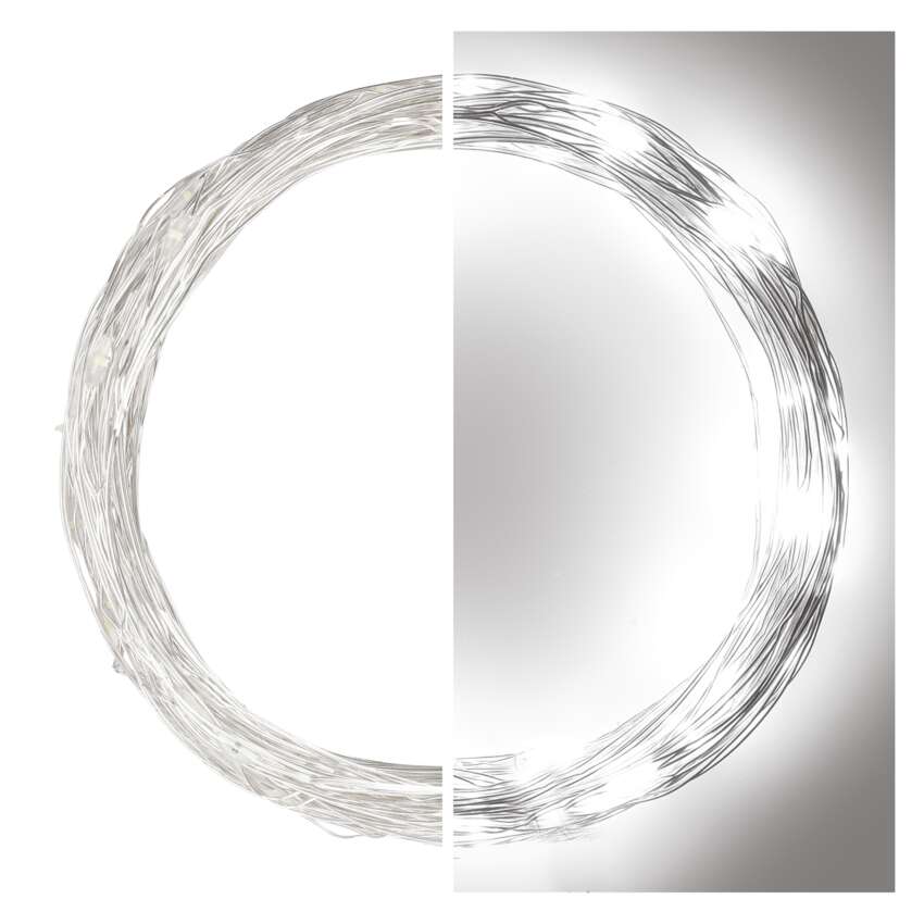 typ zasilania: zasilacz sieciowy, kształt: nano, ilość LED: 100, odstęp między diodami LED: 10 cm, wielkość diod LED: 3 mm (nano), długość przewodu: 5 m, do wysokości choinki: 160 cm, kolor przewodów: srebrna, moc: 2,7 W, napięcie wejściowe: 230 V AC, napięcie wyjściowe: 4,5 V DC, możliwość podłączenia: nie, stopień ochrony: IP44, żywotność: 10 000 godzin, materiał: metalowy, okres gwarancyjny: 2 lata, opakowanie: 1 szt., pudełko