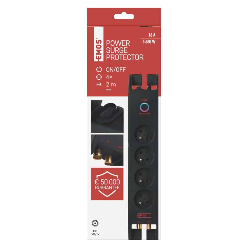 gwarancja: 50 000 €, ilość gniazd: 4× 2P + PE, długość: 2 m, napięcie znamionowe: 230 V~, 50 Hz, maksymalne obciążenie: 16 A max., maksymalne obciążenie: 3 680 W, żyła: H05VV-F3G 1,5 mm², absorpcja energii: 1 800 J, poziom ochrony Up: 1,7 kV (L/N-PE, L-N), udar próbny U0c: 6 kV, czas reakcji: <1 ns, filtr EMI/RFI, zakres częstotliwości: 150 kHz–100 MHz, tłumienie: do 40 dB, ochrona przewodu antenowego: tak, IEC, kolor: czarny, przesłony torów prądowych, wskaźnik podłączenia, wskaźnik przepięcia, wymiary: 342 × 66 × 50 mm, opakowanie: 1 szt., pudełko, okres gwarancyjny: 2 lata