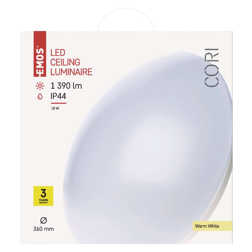 źródło światła: LED, moc: 18 W, odpowiednik oprawy: 90 W, stopień ochrony: IP44, strumień świetlny: 1 390 lm, temperatura barwowa: 3 000 K, barwa światła: ciepła biel, kształt: koło, materiał obudowy: blacha stalowa, materiał osłony: tworzywo (PMMA), typ klosza: mleczny, indeks oddawania barw (CRI): Ra > 80, kąt świecenia: 120°, sposób montażu: natynkowa, wymiary: średnica 360 × 105 mm, kolor obudowy: biały, częstotliwość: 50/60 Hz, napięcie: 220–240 V, pojemność: 140 mA, kategoria: CLASSIC, rodzaj: CORI, okres gwarancyjny: 3 lata, opakowanie: 1 szt., pudełko, żywotność: 30 000 godzin, współczynnik mocy: > 0,5, skuteczność świetlna: 77 lm/W, LGP materiał: nie dotyczy, flicker-free, prąd wyjściowy ze źródła: nie dotyczy, klasa energetyczna (od 1.9.2021): F