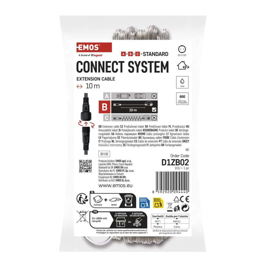 produkt: przedłużacz, dla serii: standard, timer: nie, pilot zdalnego sterowania: nie, zastosowanie: zewnętrzne i wewnętrzne, maks. ilość połączeń: 800 LED, kolor przewodów: transparentny, długość przewodu: 10 m, napięcie wejściowe: 30 V DC, stopień ochrony: IP44, żywotność: 10 000 godzin, materiał: tworzywo, okres gwarancyjny: 2 lata, opakowanie: 1 szt., zawieszka