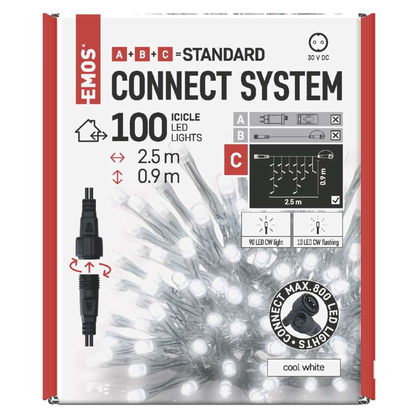typ zasilania: zasilacz sieciowy (brak w zestawie), kształt: klasyczny, ilość LED: 100, odstęp między diodami LED: 10 cm, wielkość diod LED: 5 mm, długość przewodu: 10 cm, do wysokości choinki: nie dotyczy, kolor przewodów: transparentny, moc: max. 5 W, napięcie wejściowe: 30 V DC, możliwość podłączenia: tak, stopień ochrony: IP44, żywotność: 10 000 godzin, materiał: PVC, okres gwarancyjny: 2 lata, opakowanie: 1 szt., pudełko