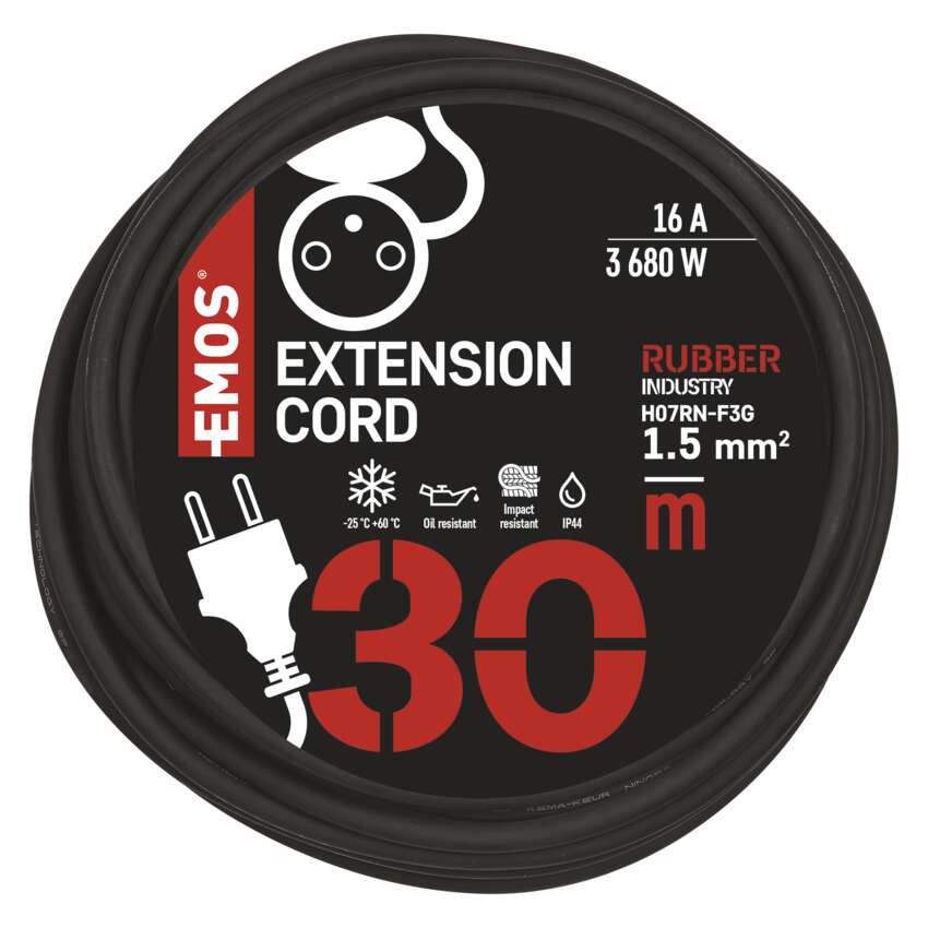 produkt: przedłużacz – 1 gniazdo, długość: 30 m, przekrój przewodów: 1,5 mm², napięcie: 230 V, prąd: 16 A, stopień ochrony: IP44, ilość gniazd: 1, typ izolacji: guma/neopren, bezpiecznik termiczny: nie, żyła: H07RN-F3G, kolor: czarny, maks. obciążenie rozwiniętego: 16 A max./3 680 W, przesłony torów prądowych: nie, okres gwarancyjny: 2 lata, opakowanie: 1 szt., woreczek