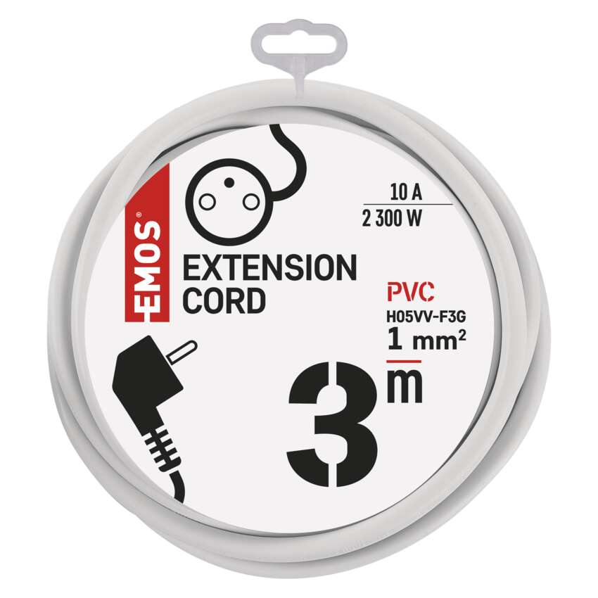 długość: 3 m, ilość gniazd: 1, maksymalne obciążenie: 2 300 W, napięcie: 250 V~, prąd: 10 A max., przekrój przewodów: 1,0 mm², kolor: biały, przewód: H05VV-F3G, materiał gniazda i wtyczki: tworzywo, typ izolacji: PVC, stopień ochrony: IP20, przesłony torów prądowych, okres gwarancyjny: 2 lata, opakowanie: 1 szt., zawieszka
