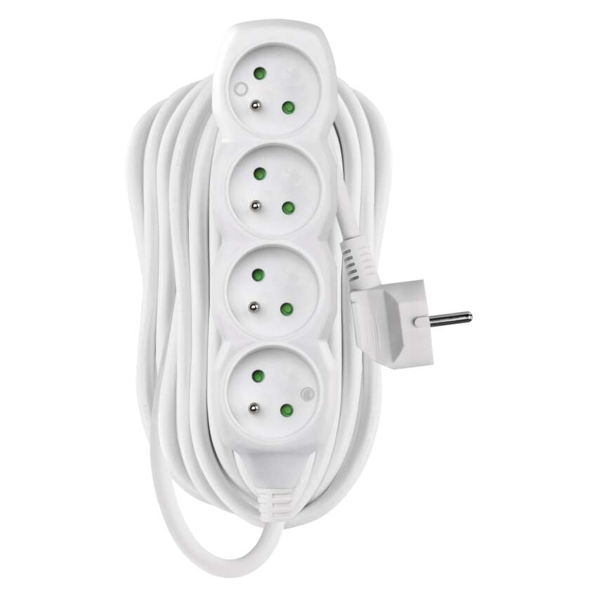 długość: 10 m, ilość gniazd: 4, maksymalne obciążenie: 2 300 W, napięcie: 250 V~, prąd: 10 A max., przekrój przewodów: 1,0 mm², kolor: biały, przewód: H05VV-F3G, materiał gniazda i wtyczki: tworzywo, typ izolacji: PVC, stopień ochrony: IP20, przesłony torów prądowych, okres gwarancyjny: 2 lata, opakowanie: 1 szt., zawieszka