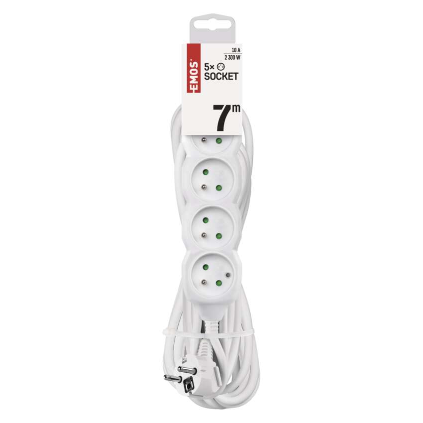 długość: 7 m, ilość gniazd: 5, maksymalne obciążenie: 2 300 W, napięcie: 250 V~, prąd: 10 A max., przekrój przewodów: 1,0 mm², kolor: biały, przewód: H05VV-F3G, materiał gniazda i wtyczki: tworzywo, typ izolacji: PVC, stopień ochrony: IP20, przesłony torów prądowych, okres gwarancyjny: 2 lata, opakowanie: 1 szt., zawieszka