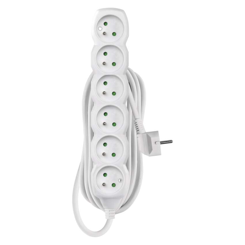 długość: 5 m, ilość gniazd: 6, maksymalne obciążenie: 2 300 W, napięcie: 250 V~, prąd: 10 A max., przekrój przewodów: 1,0 mm², kolor: biały, przewód: H05VV-F3G, materiał gniazda i wtyczki: tworzywo, typ izolacji: PVC, stopień ochrony: IP20, przesłony torów prądowych, okres gwarancyjny: 2 lata, opakowanie: 1 szt., zawieszka