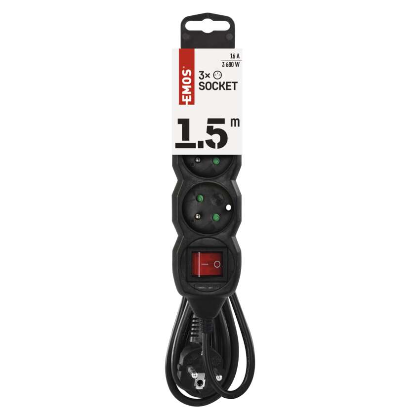 długość: 1,5 m, ilość gniazd: 3, maksymalne obciążenie: 3 680 W, napięcie: 250 V~, prąd: 16 A max., przekrój przewodów: 1,0 mm², kolor: czarny, przewód: H05VV-F3G, materiał gniazda i wtyczki: tworzywo, typ izolacji: PVC, wyłącznik, stopień ochrony: IP20, przesłony torów prądowych, okres gwarancyjny: 2 lata, opakowanie: 1 szt., zawieszka