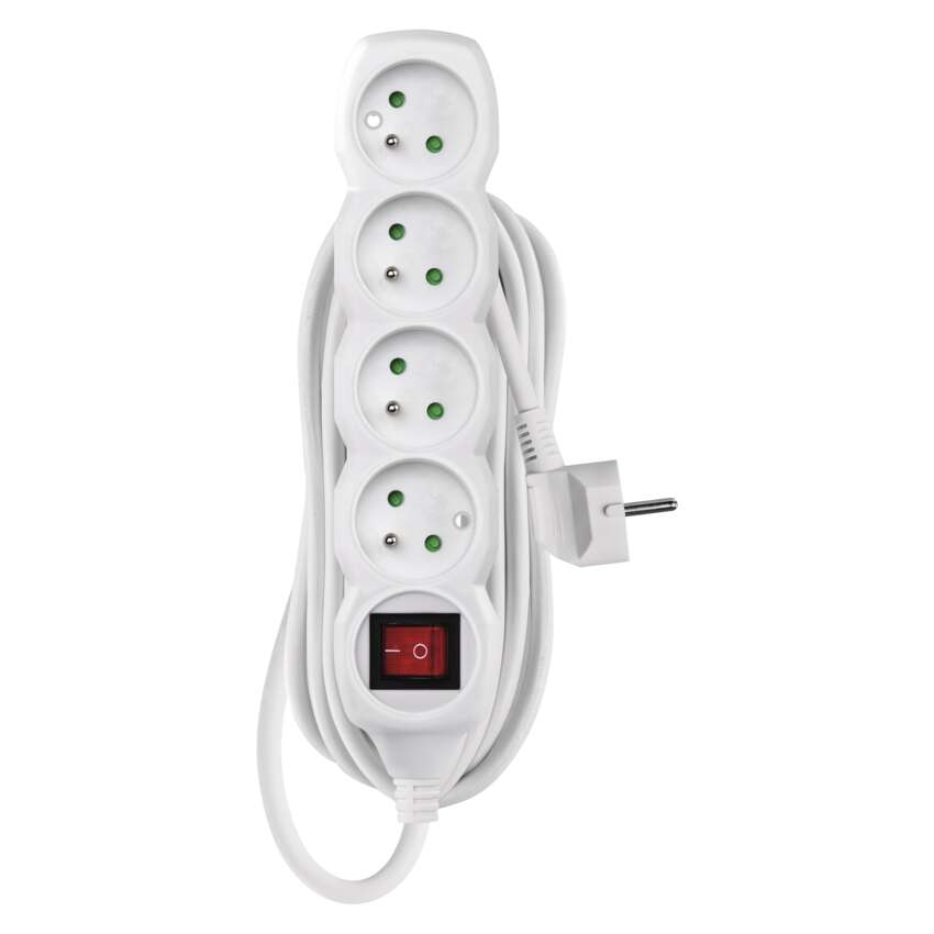 długość: 5 m, ilość gniazd: 4, maksymalne obciążenie: 2 300 W, napięcie: 250 V~, prąd: 10 A max., przekrój przewodów: 1,0 mm², kolor: biały, przewód: H05VV-F3G, materiał gniazda i wtyczki: tworzywo, typ izolacji: PVC, wyłącznik, stopień ochrony: IP20, przesłony torów prądowych, okres gwarancyjny: 2 lata, opakowanie: 1 szt., zawieszka