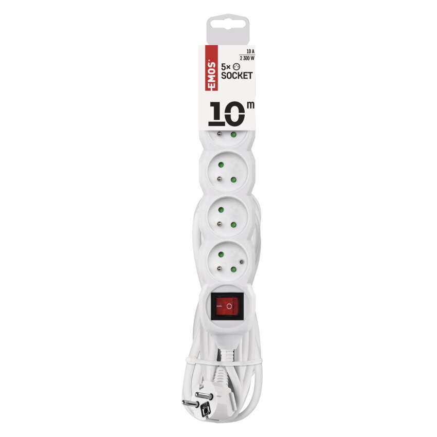 długość: 10 m, ilość gniazd: 5, maksymalne obciążenie: 2 300 W, napięcie: 250 V~, prąd: 10 A max., przekrój przewodów: 1,0 mm², kolor: biały, przewód: H05VV-F3G, materiał gniazda i wtyczki: tworzywo, typ izolacji: PVC, wyłącznik, stopień ochrony: IP20, przesłony torów prądowych, okres gwarancyjny: 2 lata, opakowanie: 1 szt., zawieszka