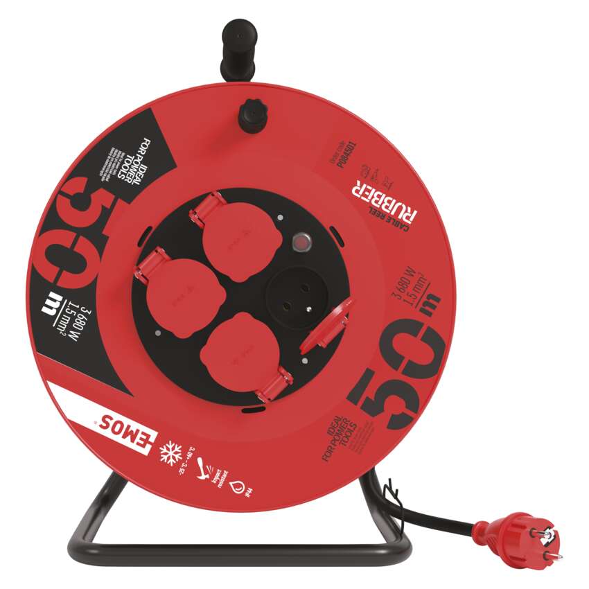 produkt: przedłużacz bębnowy, długość: 50 m, przekrój przewodów: 1,5 mm², napięcie: 230 V, prąd: 16 A, stopień ochrony: IP44, ilość gniazd: 4, typ izolacji: guma, bezpiecznik termiczny, żyła: H05RR-F3G, kolor: czarny, maks. obciążenie zwiniętego przedłużacza: 4,8 A max./1 100 W, maks. obciążenie rozwiniętego: 16 A max./3 680 W, przesłony torów prądowych: nie, wymiary: 300 mm, okres gwarancyjny: 3 lata, opakowanie: 1 szt., pudełko