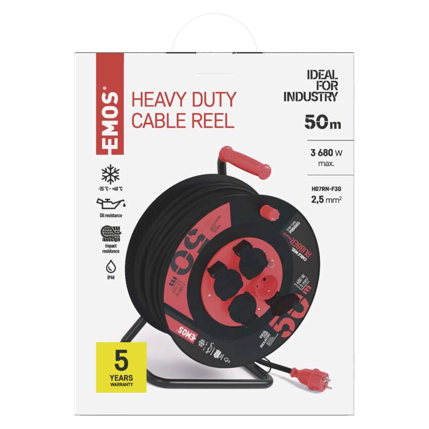 produkt: przedłużacz bębnowy, długość: 50 m, przekrój przewodów: 2,5 mm², napięcie: 230 V, prąd: 16 A, stopień ochrony: IP44, ilość gniazd: 4, typ izolacji: guma/neopren, bezpiecznik termiczny, żyła: H07RN-F, kolor: czarny, maks. obciążenie zwiniętego przedłużacza: 5,6 A max./1 300 W, maks. obciążenie rozwiniętego: 16 A max./3 680 W, przesłony torów prądowych: nie, wymiary: 300 mm, okres gwarancyjny: 5 lat, opakowanie: 1 szt., pudełko