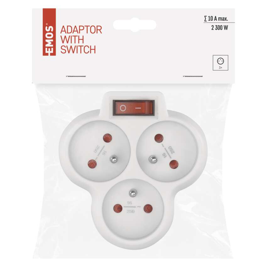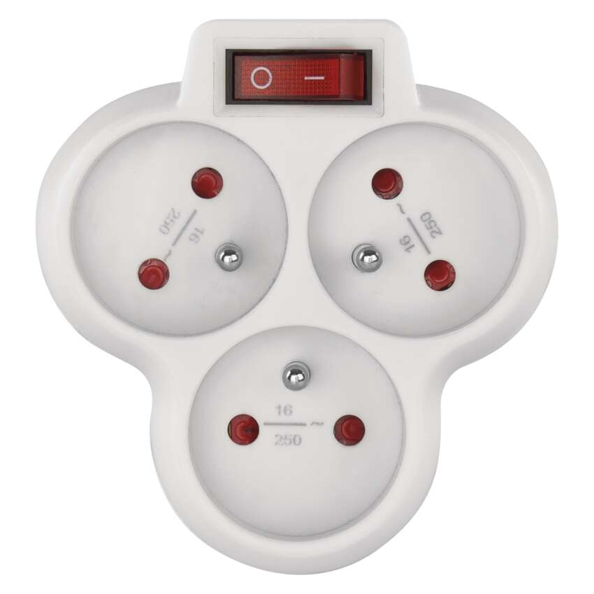 produkt: rozgałęźnik 3× z wyłącznikiem, typ: FRENCH, napięcie/prąd: 250 V~/10 A max., maksymalne obciążenie: 2 300 W, kolor: biały, wyłącznik, przesłony torów prądowych, stopień ochrony: IP20, materiał: tworzywo, ilość gniazd: 3× 2P + PE, opakowanie: 1 szt., zawieszka, okres gwarancyjny: 2 lata