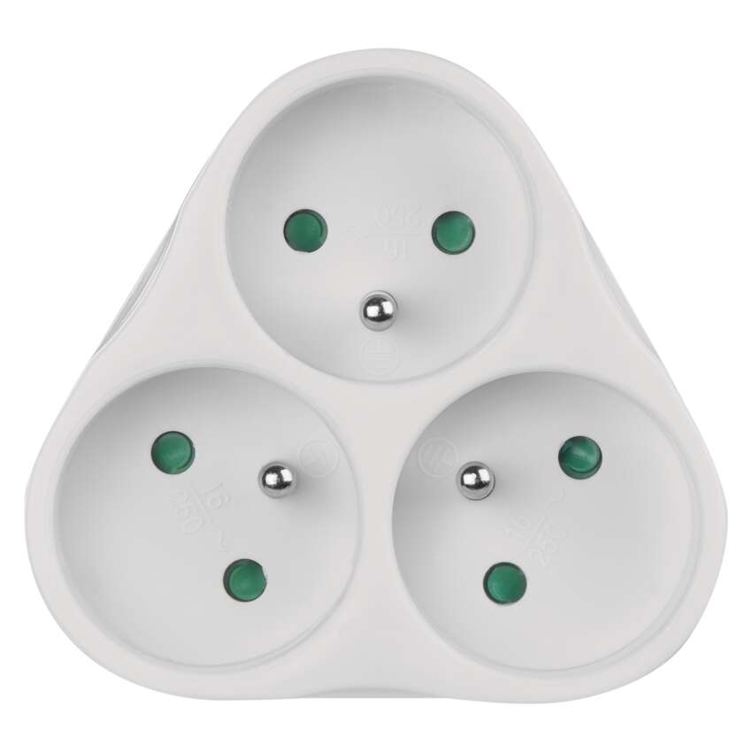 produkt: rozgałęźnik 3×, typ: FRENCH, napięcie/prąd: 250 V~/10 A max., maksymalne obciążenie: 2 300 W, kolor: biały, przesłony torów prądowych, stopień ochrony: IP20, materiał: tworzywo, ilość gniazd: 3× 2P + PE, opakowanie: 1 szt., zawieszka, okres gwarancyjny: 2 lata