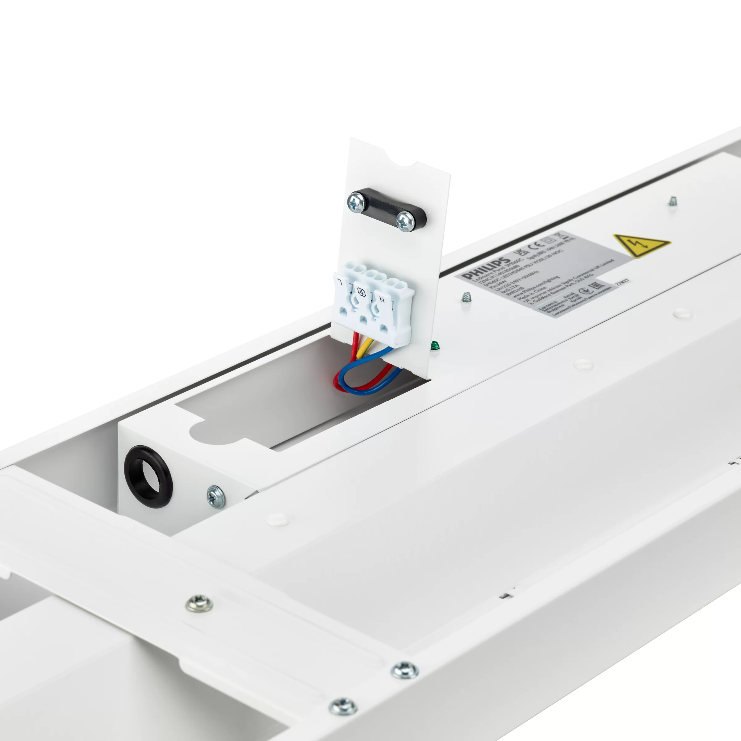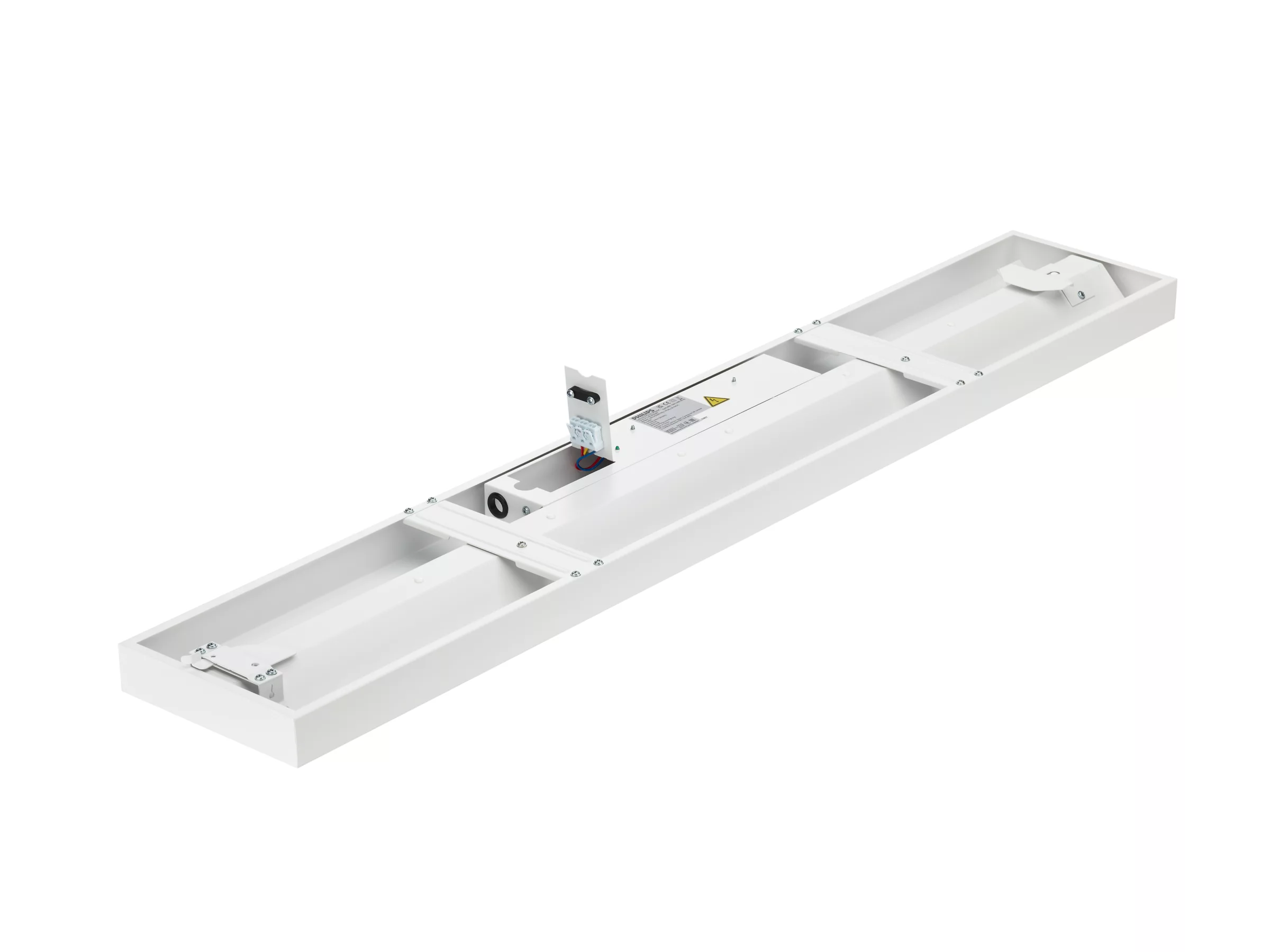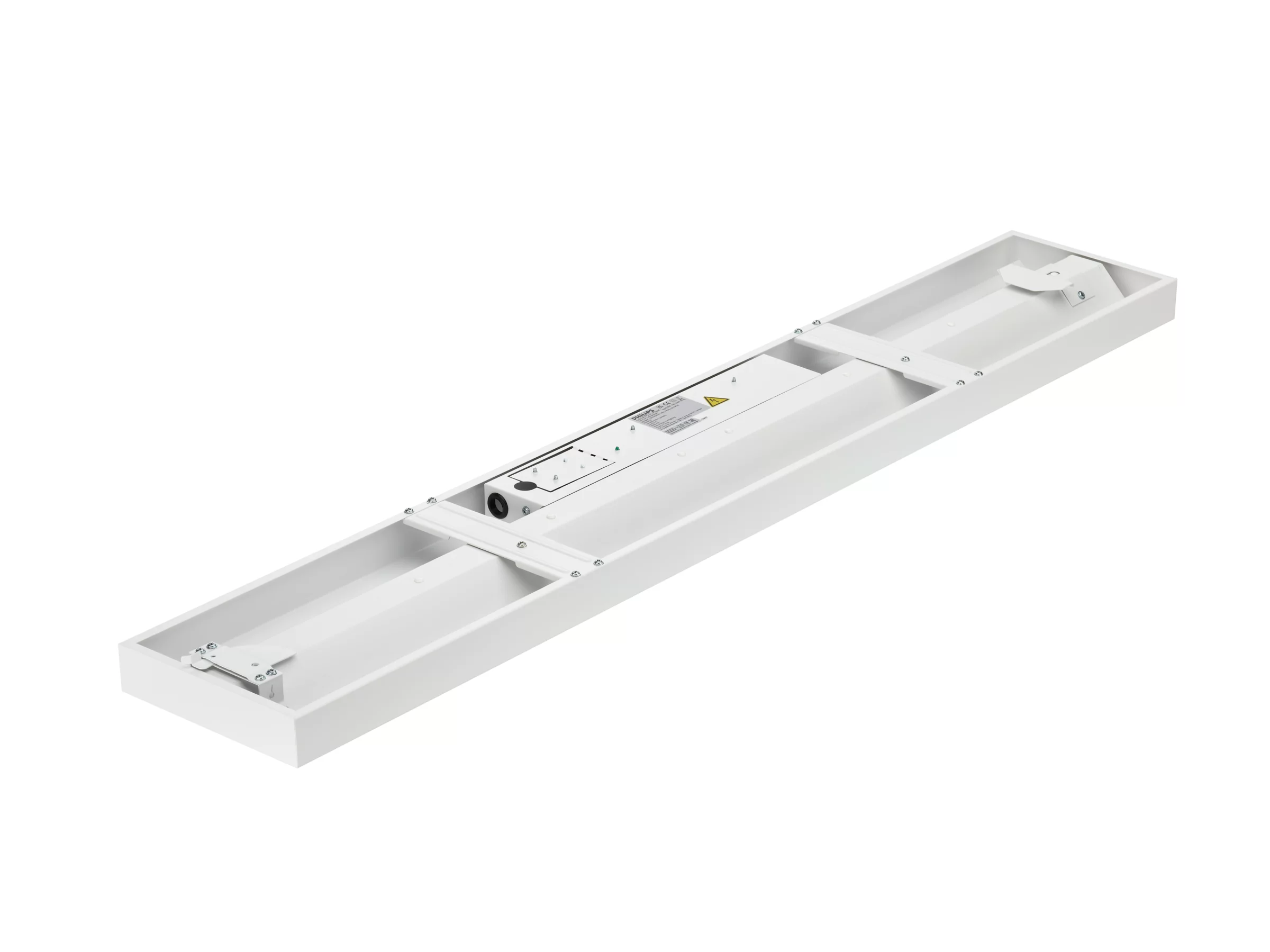 1200×200 mm, Stal, Biel, Sygnałowy biały (RAL9003), Zasilacz (wł./wył.), 3400 lm, 34 W, 100 lm/W, 4000 K, SDCM5, Kąt rozsyłu światła 110°, Opalizowany, Polimetakrylan metylu, IP20 | Ochrona przed dotknięciem palcem, IK03 | 0,3 J, Klasa bezpieczeństwa I, Szybkozłączka 3-biegunowa
